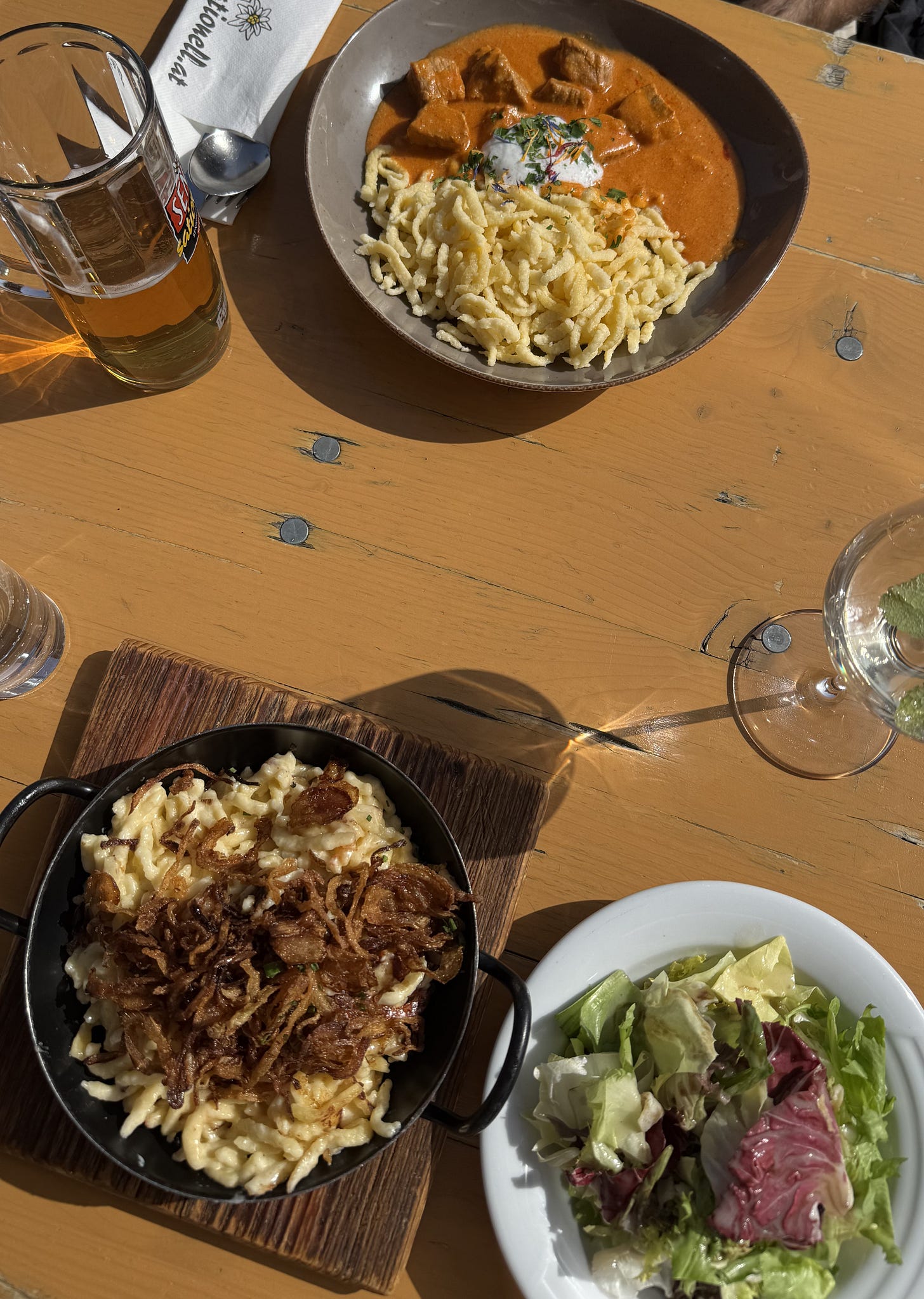 My favorite of the on-mountain restaurants that we tried. Exactly what you want in the Alps—hut style outdoor seating in the sun with an amazing view and phenomenal food. The Spätzle with crispy onions and salad from here was perfect to me in every way.