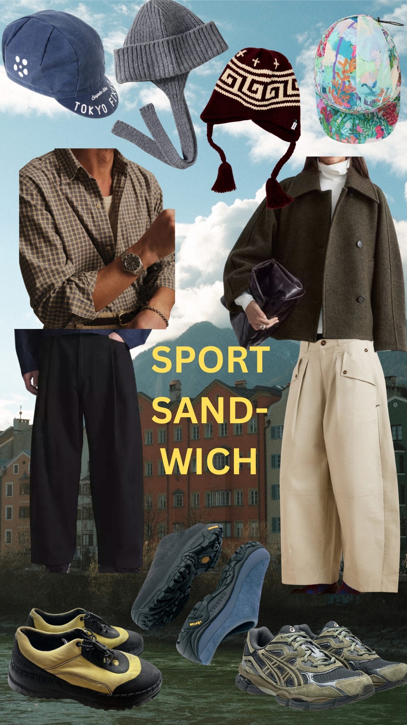 A Sport Sandwich might consist of an outfit made up of a “city” coat, a dress shirt, a trouser, all sandwiched by sporty shoes and a sporty cap. This brings in function where it’s most needed, on your feet and atop your head. Coat and pants offer a lot of room to dress up a look without loosing much comfort or function. Lucky for us in post-gorp world, there are a lot of great “hybrid” trousers out there (even if not marketed as such.) Pants that look and feel like a dressier option but can be worn just as well for hiking/camping etc. A chino, a parachute pant, the right pair of jeans, a wool trouser, etc.