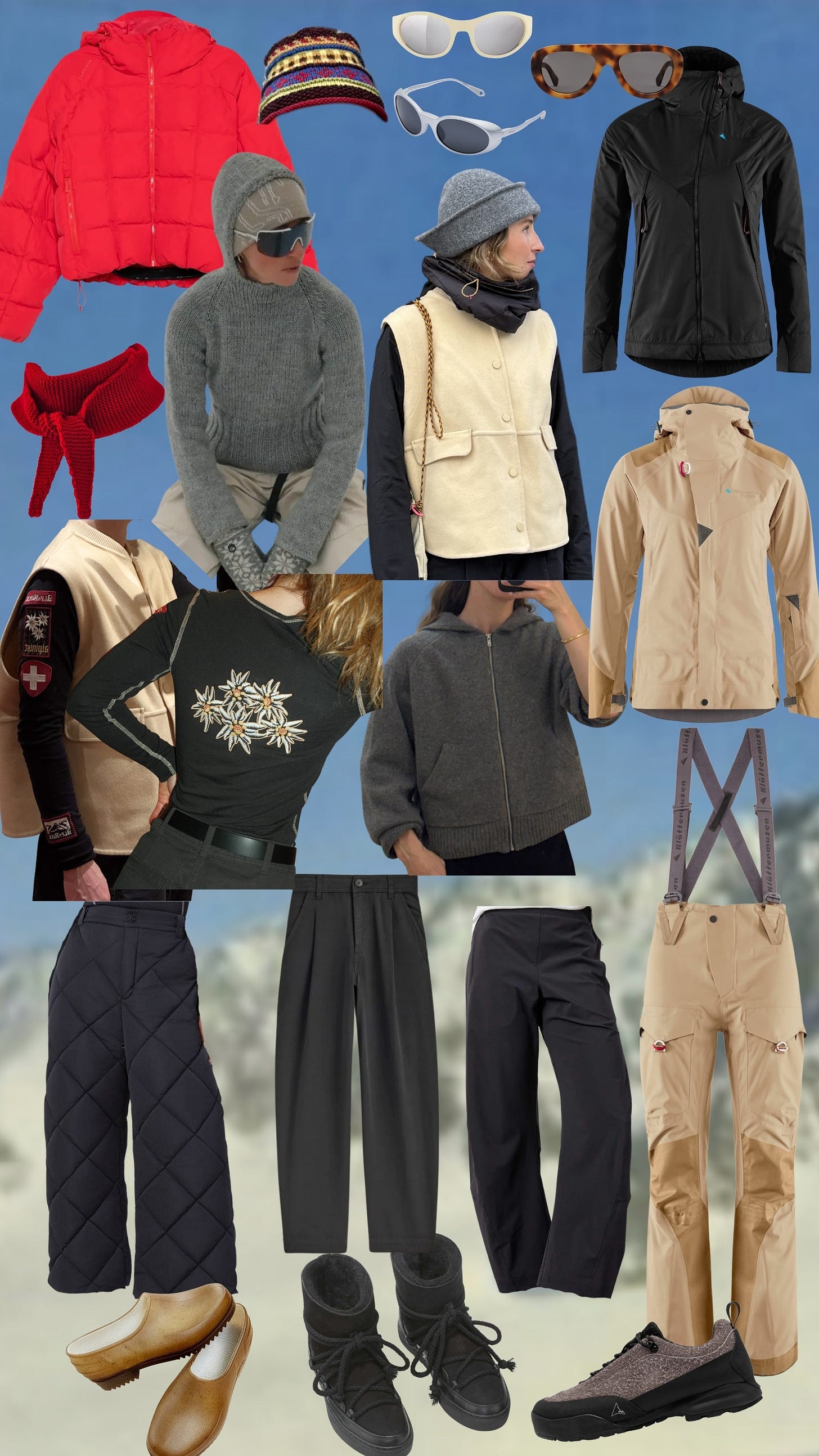 Red ski puffy from Cordova. Handknit hat. Sunglasses from Alba, Ridar, and Jimmy Fairly. Midlayer from Klattermusen. Red Sophie Scarf. Handknit wool sweater. Sézane Vest. Edelweiss long sleeve from Alp N Rock. Wool/cashmere hoodie from Everlane. Ski jacket and bibs from Klattermusen. Down pants from Alp N Rock. Black trousers from Everlane. Black travel pants from Ruti. Plastica clogs. Inuikii boots. Roa Hiking shoes. I also packed pajamas, base layers, a t-shirt, socks, etc.