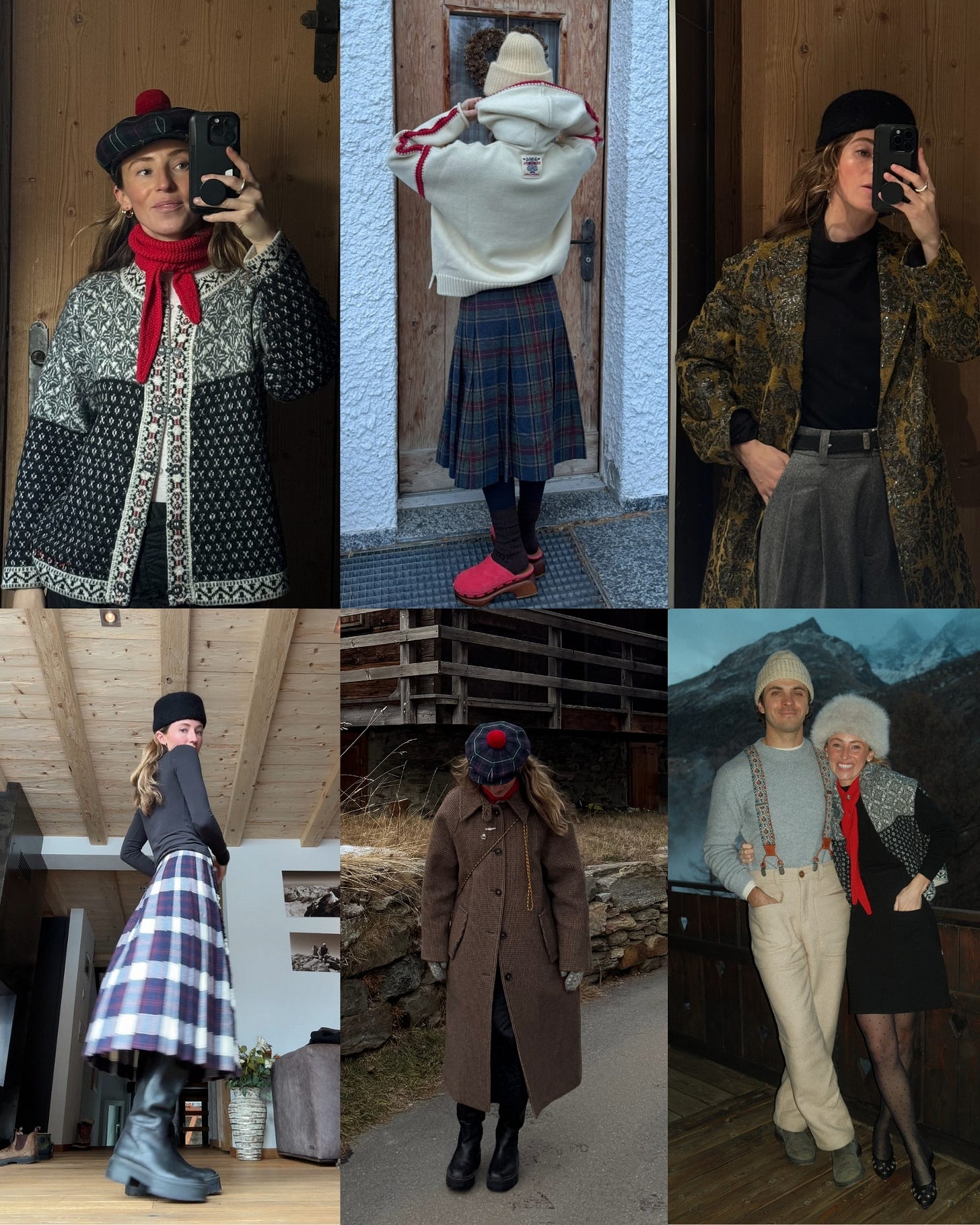 I brought things like these fun (but less practical) Staud clogs, floofy faux-fur hat, TWO kilts (not necessary) and a few other fun and festive garments I never ended up wearing. This is because, at the end of a ski day—after the baselayers come off—most of the time you just want to go straight for pajamas. Or at least cozy clothes. So finding non-ski clothes that are soft and warm (that also aren’t sweats) is a really a good approach.