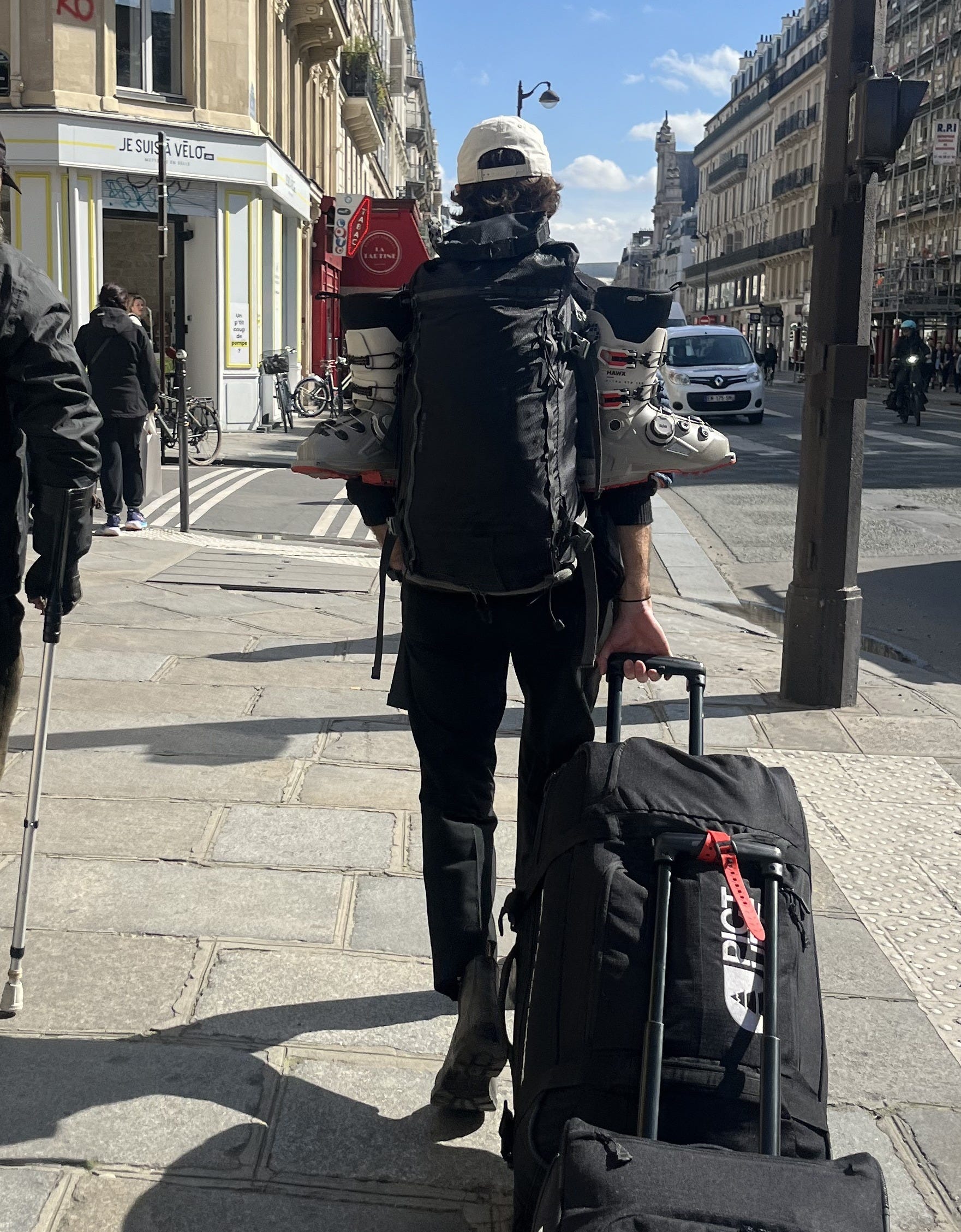 For my carry on and personal item, I bring my ski backpack and ski boots. If you’re wondering why you wouldn’t just put your ski boots in the ski bag, the thinking here is that if (when) your luggage gets lost, it’s easy to piece together/rent/borrow pretty much all other gear except for ski boots. Don’t even tempt the airline gods with putting them in the bag— they will smite you. I attach my velcro straps together and drape them over my backpack, taking them down in my hand when I walk through the aisle of the plane, as to not klonk the daylights out of the business class folks. Cody demonstrates the boot drape below, strolling through Paris: