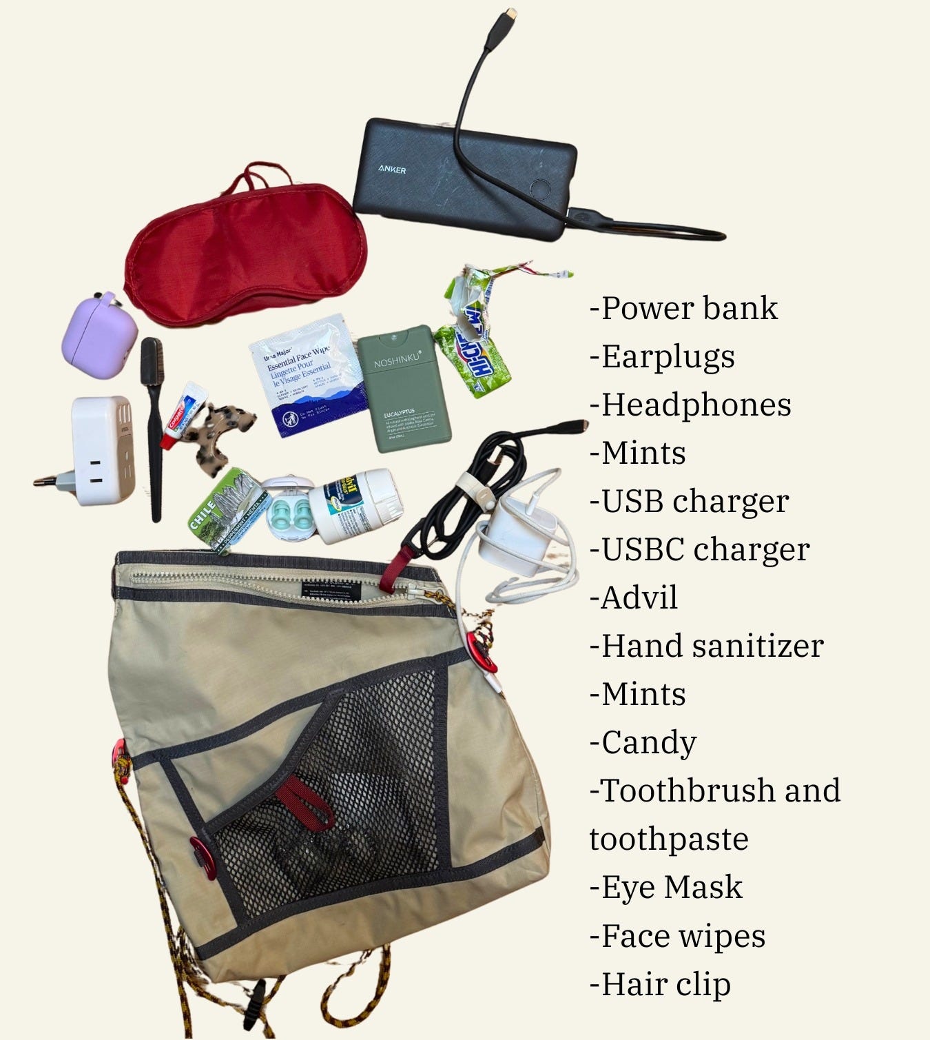 I always have a little bag of quick things to store in the seat compartment on the airplane. Here’s what’s in my bag this time: