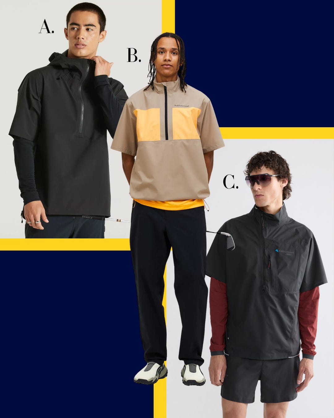 Leave it to the mountain bikers, the golfers, and the Swedes to cut off the forearms in the name of functionality. Sleeveless rain jackets breathe and move better compared to long sleeves, plus they give you a little more to play with in terms of silhouette and layering. Go short sleeve over long sleeve and—voila—gorp meets grunge 🤝.