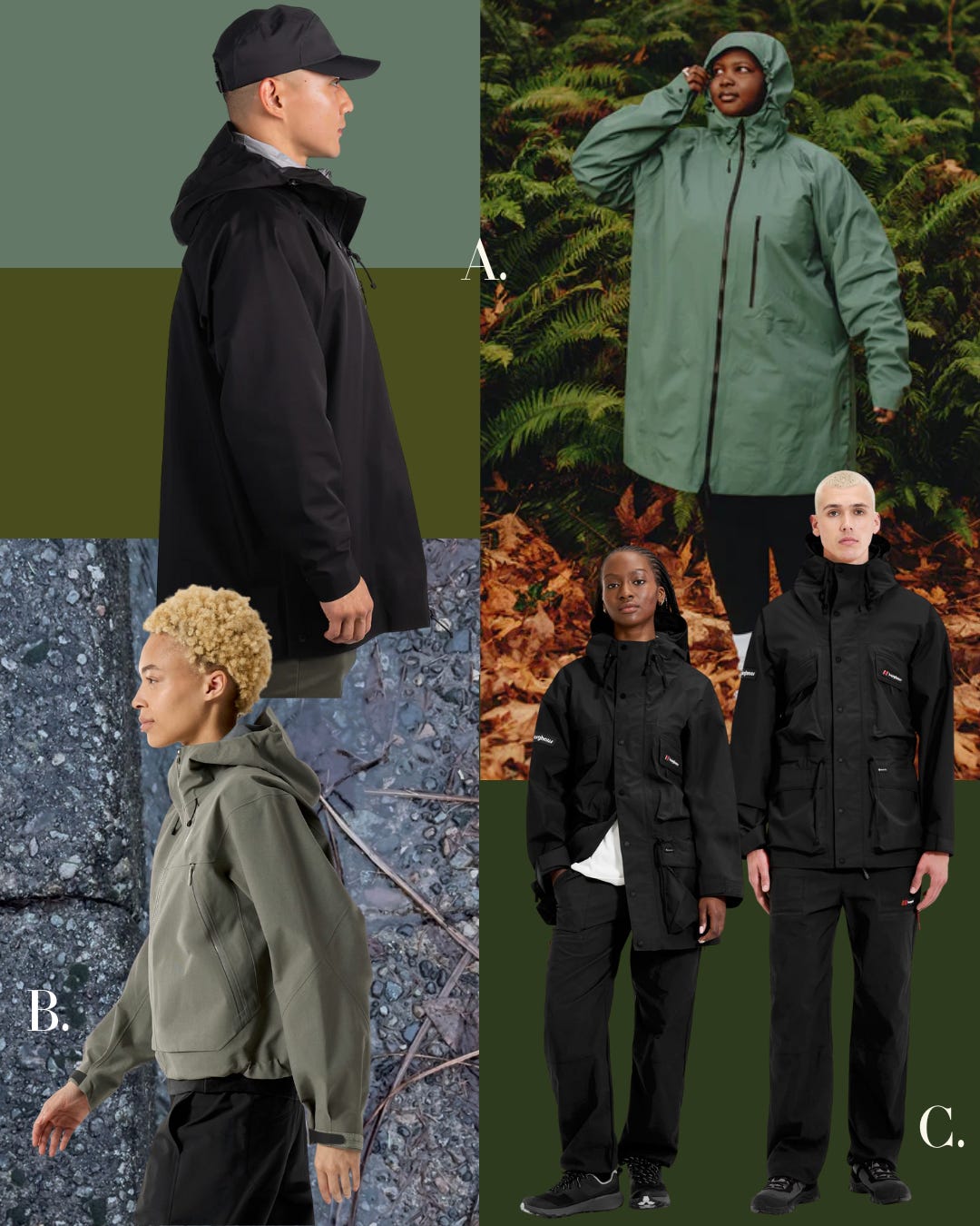 C. If most GORE-TEX jackets read granola, Berghaus’ Trango GORE-TEX Jacket offers a bit of British prep flavor. Originally designed for mountain expeditions in the 80s, the Trango had a pop culture moment in the 90s when Oasis frontman Liam Gallagher wore it on stage during a concert in Oslo. Berghaus re-released the jacket, which has a cinched waist and a buttoned placket that covers the zipper, with more modern specs earlier this year.