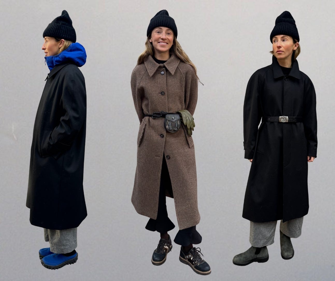 Wool jackets are perhaps the best substitute to make here, as their hydrophobic fibers help keep them from getting too saturated with moisture. Below, Kellyn wears her two wool “rain jackets.” The black one is from Dunst and the tan one is from Le; both, she says, are good enough for parched Colorado.
